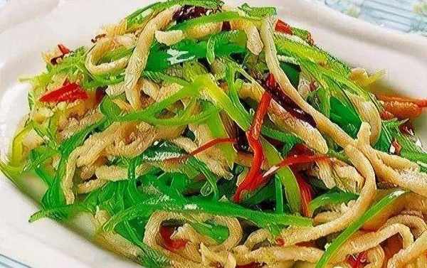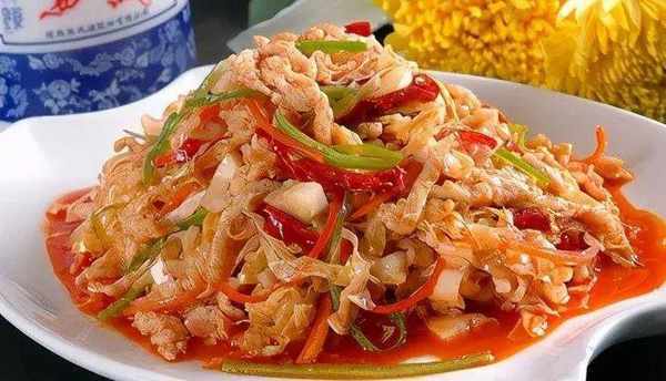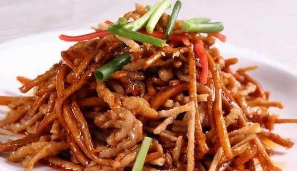 1. 將豬蓋板肉或彈子肉洗凈後切成約10厘米長、0.5厘米粗的絲。薑(洗凈拍破)、蔥、鹽、料酒調勻,與肉絲拌勻著味約30分鐘。