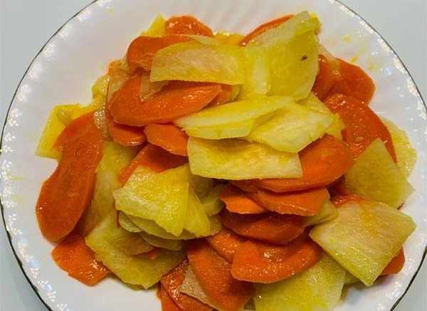 3、翻炒兩分鐘放入沙葛,我們老傢叫地瓜。