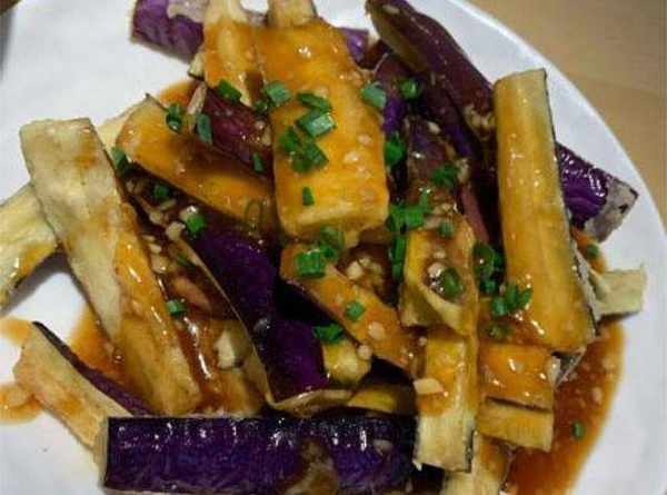 茄子一條、蔥適量、淀粉適量、蒜適量、醬油適量、番茄醬適量、糖適量、鹽適量、醋適量。