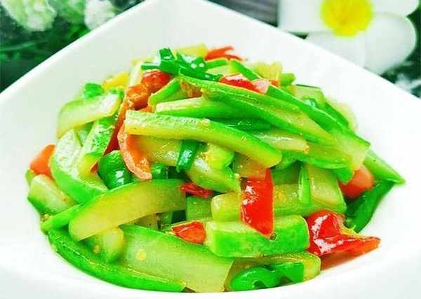 5、下入瓠子皮,加鹽翻炒斷生至軟。