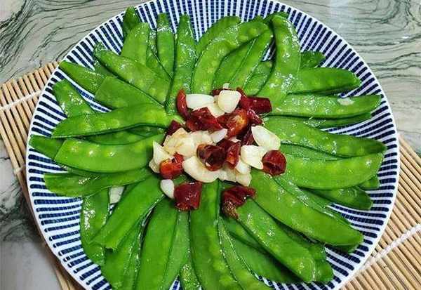 荷蘭豆200克、蒜頭少許、幹辣椒少許、油少許、鹽少許。