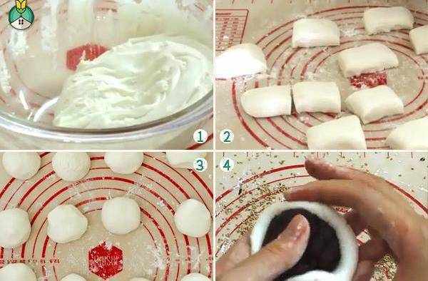 04.挖2大勺紅豆沙搓團,然後放在糯米面餅中心,慢慢從邊緣往上揉捏直至包起來。捏緊收口並滾圓幾下以確保包緊。