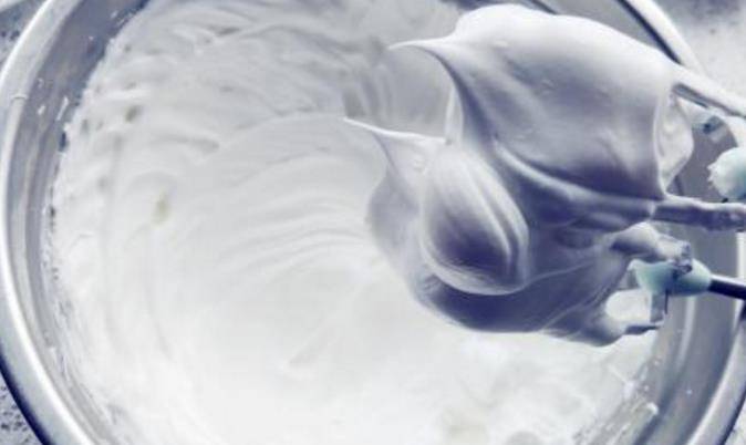 蛋清當中滴入幾滴檸檬汁,然後再加入適量的白砂糖,這樣我們將蛋清打發,直至拉出小尖角。
