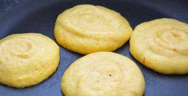 這樣我們將平底鍋加熱之後,用裱花袋擠到平底鍋當中小圓餅,如果大傢喜歡厚一些的話可以記得高一點,然後再滴上兩滴水蓋上蓋子,小火加熱兩分鐘左右,然後再翻過來煎另一面,等到全部上色之後就可以出鍋瞭。