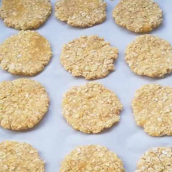 第三步、準備一個烤盤,放入一張吸油紙,然後把餅放在烤盤上,烤箱提前上下180提前預熱十分鐘,十分鐘後,把餅放入烤箱內,再把上下溫度調至170度,烤25分鐘左右即可拿出裝盤。