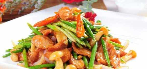 1.將豬頸肉用刀切成條,用適量的醬油醃制。白玉菇處理幹凈,蒜薹切成段,然後所有原料分別入鍋拉油制斷生備用。