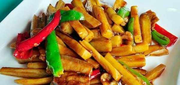 1.將杏鮑菇用刀切成條,入鍋炸制金黃色待用。五花肉用刀切成片: