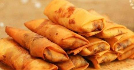 用料:春卷皮、紅豆沙、油、白糖