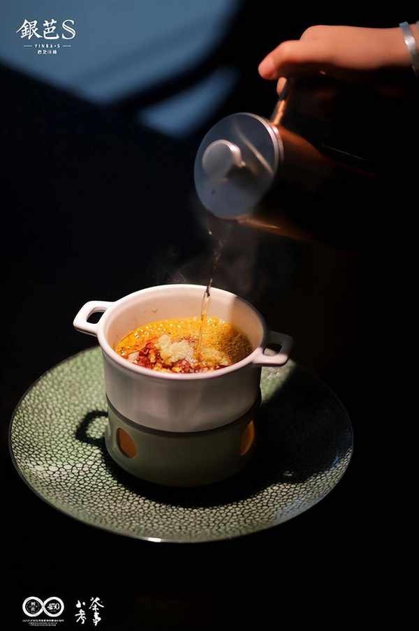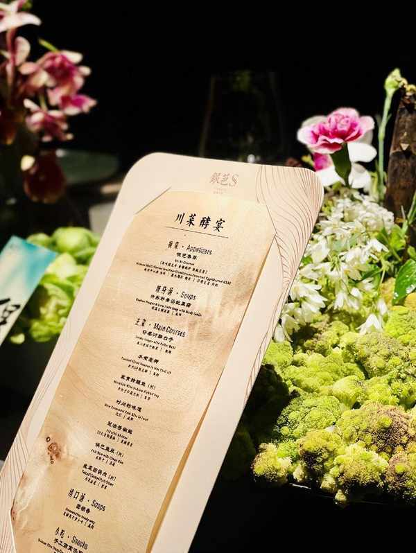 本次宴會桌擺用食物的原材料以“花藝”的形式呈現,宴會的菜單也采用純樹皮打磨制作而成,呈現出春醒萬物之態,搭配本次菜品,為嘉賓帶來瞭全新的感官體驗。作為匠藝川菜品牌,銀芭S在推廣川菜文化上也不餘遺力,本次川菜酵宴以川酒“國窖1573”、川茶“茶事小考”搭配菜單,按照味覺起伏呈現川菜之味。麻辣、咸鮮、酸辣、傢常、發酵醬香、香甜......不同的川菜味型在菜品中一一呈現;鹿柳、皮蛋、鵝肝、魚......山海百味被精心呈現。