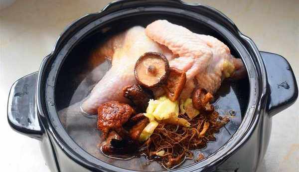 把三七根、2塊拍碎的生薑、10朵泡發好的香菇全放到砂鍋裡,然後倒入足量的清水。
