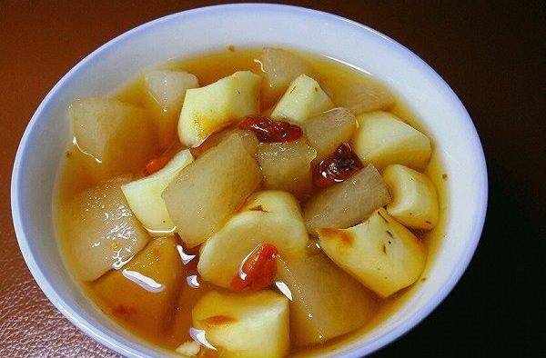 下面再將川貝母9克進行洗幹凈打碎,雪梨需要連皮洗凈,去蒂和梨心,梨肉連皮切小塊。然後各物料全部放入沸水鍋內,文火煮2小時,調味後隨量飲用。