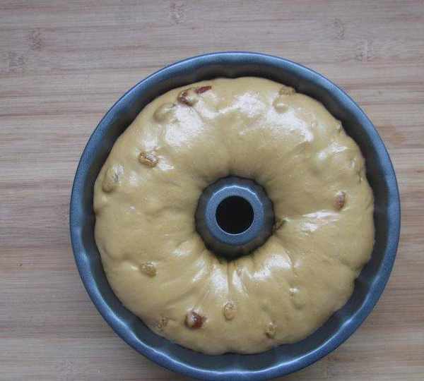 第10步、將模具放進烤箱,烤箱底再放上一碗的溫水,保持一定的濕度,室溫將面團發至模具的8分滿即可。