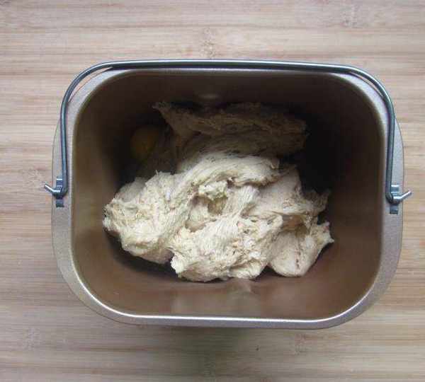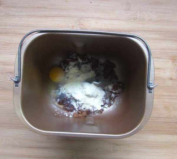 第4步、將軟化的紅糖捏碎瞭和剩下的15克雞蛋一起放進面包機桶裡。