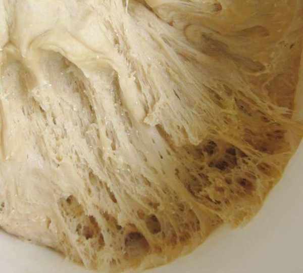 第3步、然後將成團的面團放在盆裡,盆面蓋上濕毛巾,室溫發酵到2.5-3倍大小,拉起來裡面是蜂窩煤的狀態。(拉開能看到下圖一樣好多的孔洞呢)