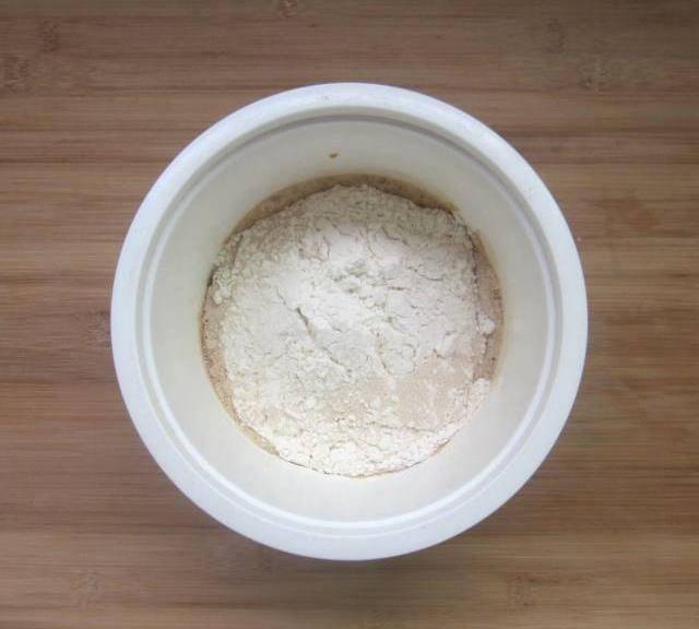第1步、將高筋面粉400克,雞蛋50克,黑啤100克,水60克,酵母5克。按先放液體材料,再放粉類材料的順序放進去。