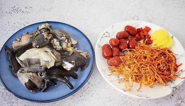 所需材料:烏雞半隻,薑3片,蟲草花20克,紅棗8粒,枸杞5克,水適量,鹽適量