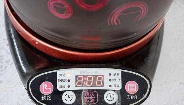 砂鍋放入烏雞、薑片,紅棗,再加入適量的清水,啟動“煲湯鍵”,默認時間為2小時