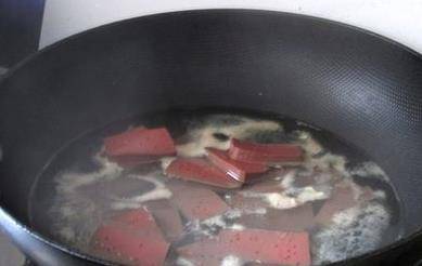 2、買回傢之後,將老豆腐和鴨血都在清水當中沖洗一下。然後鍋中放入適量的清水,將鴨血切成塊兒之後冷水下鍋,大火煮開之後繼續煮5分鐘左右,這樣焯一下水可以使鴨血更加筋道入味,也可以去除牙血的腥味。豆腐切成塊兒之後放在水中浸泡一會。