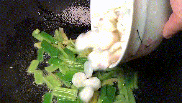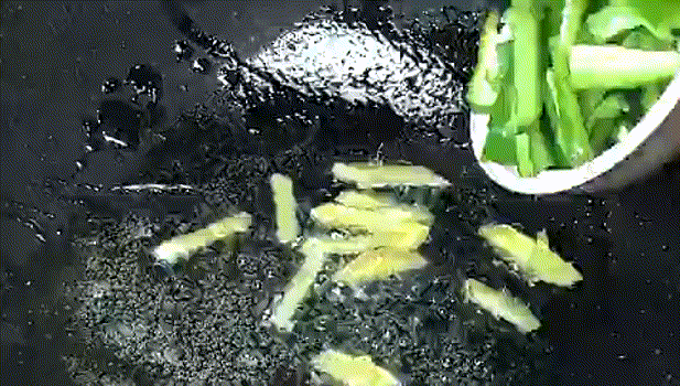3.鍋中放入適量的油,下入生薑絲,青椒翻炒。