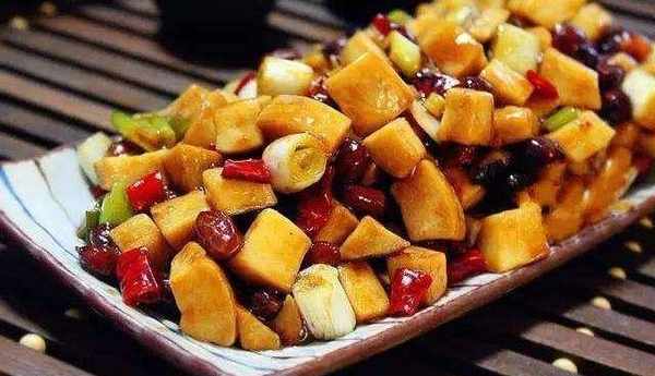 然後我們需要將這個杏鮑菇進行洗幹凈後再切成小丁,還需要進行裹上幹淀粉待用。而花生則是需要進行炸熟再放涼的,然後再把蔥、薑、蒜等進行改刀。