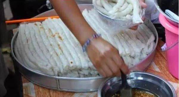 這種叫做豬腸饃,因外形像腸子而得名,外皮是用我們平時吃到的果條,隻是那些是被切成小條小條的瞭,在果皮裡放上些肉餡,放蒸鍋裡蒸熟就可以拿出來賣瞭,要淋上店傢調配的醬汁就會更好吃,那醬汁也很容易做,隻要把蒜末倒入些醬油和開水就行瞭,每天早餐都要吃上一碗,受到很多的歡迎,也有的會自己在傢裡做。