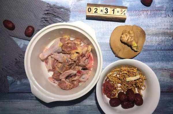 1.準備配料:生薑洗凈去皮切片;紅棗3-4顆,洗凈去核切薄片,枸杞一小抓,蟲草花適量,一起洗凈,浸泡幾分鐘;雞肉放入一勺食鹽,一瓶蓋料酒,幾片生薑,醃制幾分鐘;
