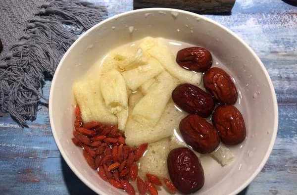 2.首先要煲湯,所以先準備煲湯的配料:竹蓀去掉頭尾,留中間,紅棗五六顆,枸杞一小抓,一起清洗幹凈,浸泡一下;