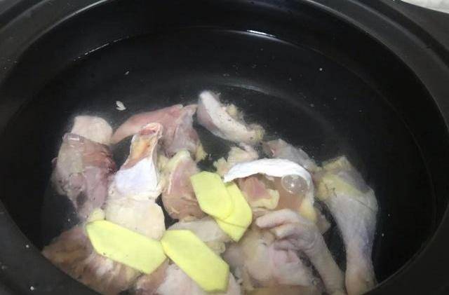 3.沙煲內裝入足夠的清水,放入半隻雞,幾片生薑片,滴入小半瓶蓋的料酒,開大火煮滾,撇去上面的浮沫,再轉中小火煲20分鐘;
