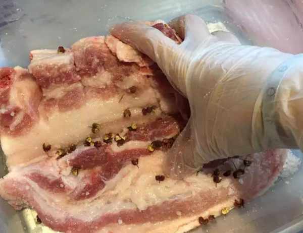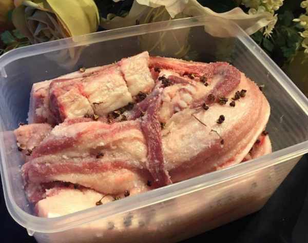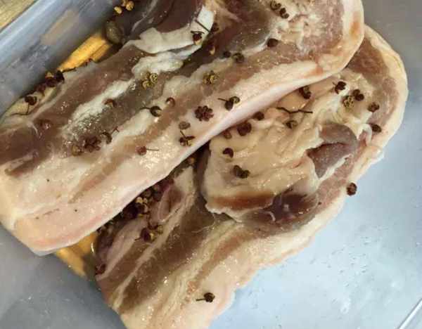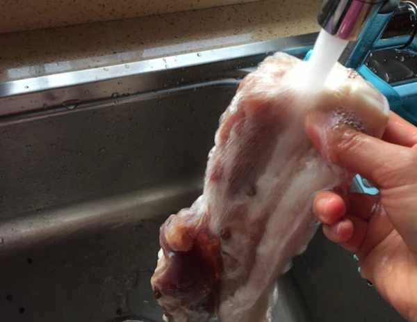 6、醃足15天後,將肉從冰箱拿出,在自來水下用溫水沖洗,註意不要過分沖洗,將表面的鹽和調料沖洗幹凈即可;