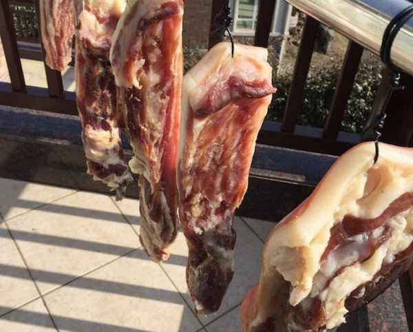 醃肉的的做法也不難。大鹽加八角、桂皮、花椒、白糖等入鍋炒熟,待炒過的花椒鹽涼透後,塗抹在魚、肉和光禽內外,反復揉搓,直到肉色由鮮轉暗,表面有水分滲出時,再把肉連剩下的鹽放進缸內,用石頭壓住,放在陰涼背光的地方,半月後取出,就可以啦。