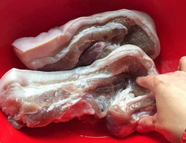 1、買5斤左右的幹凈五花肉,回傢不用洗,切成一斤左右的大塊;