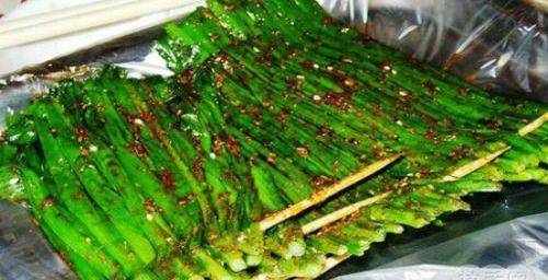 2.在烤架上生火,刷上植物油,把韭菜串放上去,用中火烤,加辣椒粉,胡椒粉和食鹽調味,烤熟後即可食用。