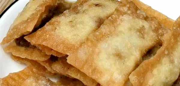 把餃子皮切成菱形塊,然後用小火用油炸至金黃起鍋,改大火再復炸一次即可。