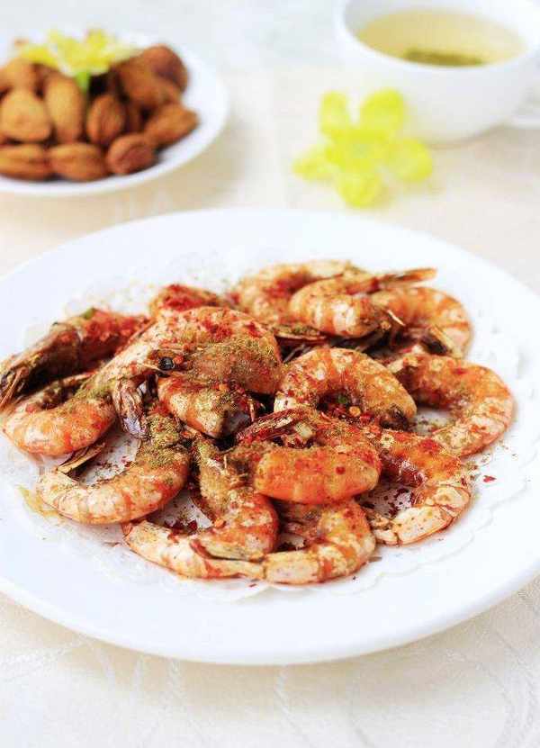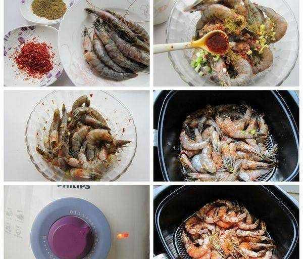 3、設置時間8分鐘,時間到瞭,聽到提示聲音,拉出炸籃,取出大蝦,撒上辣椒粉和孜然粉即可
