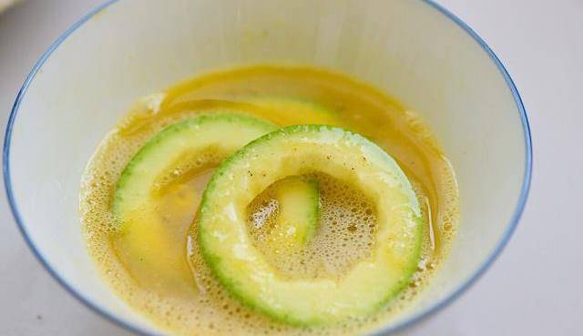 1、西葫蘆洗凈,瀝幹水分,切成厚片。