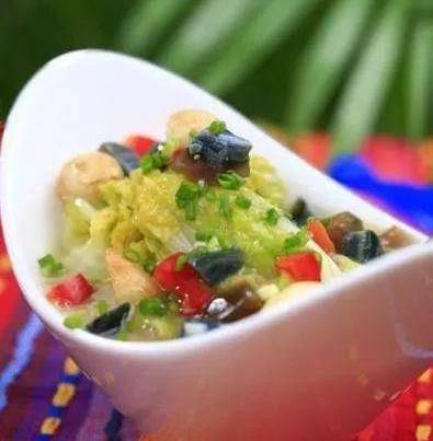 松花蛋最好提前蒸熟,一會好切娃娃菜洗凈,1劈4段;紅椒、皮蛋切丁,香蔥切末、蒜去掉兩頭備用蒜仔熗鍋,煎成及黃色出香味蒜焦瞭但不糊的時候,放入雞湯燒開水開後將娃娃菜放入,皮蛋丁放入蓋蓋再煮開,煮到娃娃菜變軟娃娃菜撈出裝盤將紅椒放入放如湯中,煮一分鐘,加入少許水淀粉勾芡,澆在娃娃菜上即可減肥餐:粗糧不爛子
