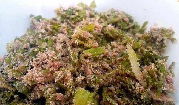 芹菜葉(或白菜、土豆、槐花都行)500g;高粱面粉70g;黃豆面粉70g;莜麥面粉70g;鹽;十三香;大蒜