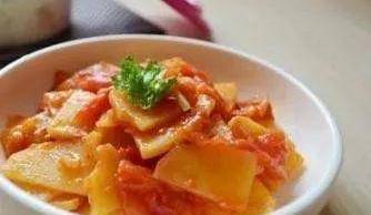 番茄切片,薑切絲,如果喜歡脆的,或者鍋不是不沾的,可以泡一下土豆片炒鍋裡放油,煸香薑絲,放入土豆片不斷翻炒,炒至有些透明放入番茄塊,加一些鹽,小火燒加一些鹽,燒入味即可。