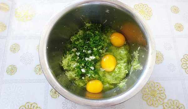 4、這時可以在西葫蘆絲裡面打入三個雞蛋,然後把香蔥也放進去,再放適量的鹽,這樣西葫蘆就有一定的咸味瞭,註意鹽不要放的太多,不然會影響口感。