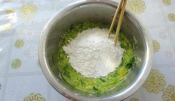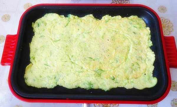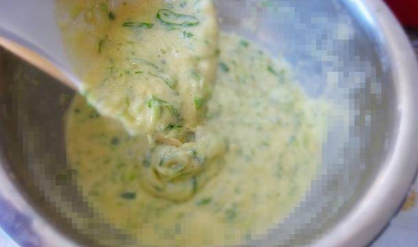 7、此時就可以在鍋裡面放入一定的油,然後刷均勻,並且倒入我們攪拌好的西葫蘆糊,不要放太多,也不要太厚瞭,一般情況下半厘米就可以瞭,不然不容易熟,用中火進行烙制兩成金黃就可以出鍋切片享用瞭,這個餅吃起來我覺得是非常好的。