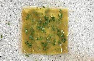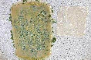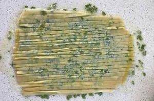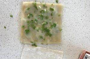 再蓋上一層混沌皮刷油、灑蔥花和鹽,一直重復操作直到蓋上第6張混沌皮