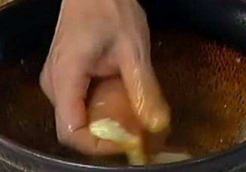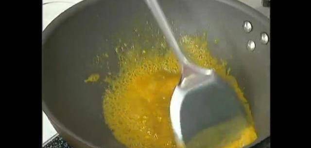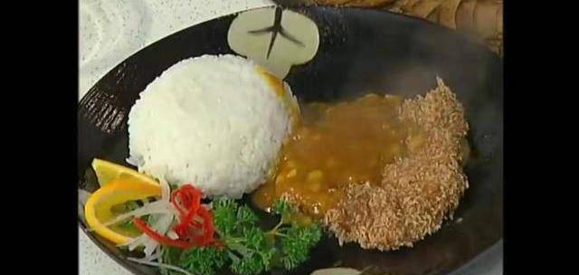 5、 鍋內留底油,放入適量咖喱粉稍加炒制,接著倒入適量水,加入少許白糖、雞精,用手勺攪拌,使咖喱粉均勻的溶解在水中;水開後,淋入適量水淀粉,至湯汁濃稠時即可;