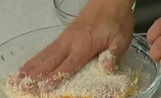 2、 放入一個全蛋再次抓揉,使豬扒均勻地裹滿蛋液,放置一邊醃漬10分鐘,備用;