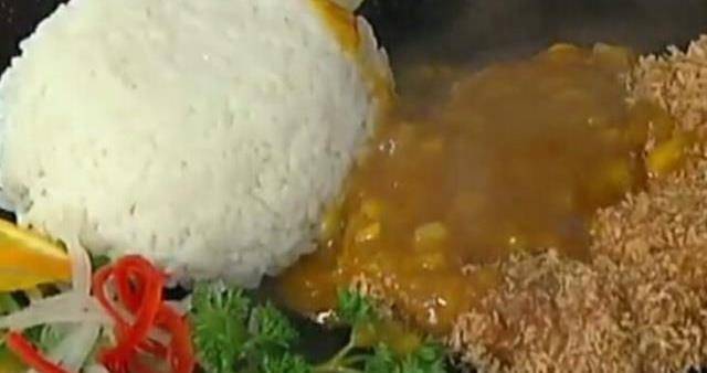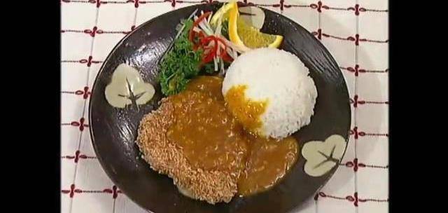 6、 將炸制、控油的豬扒擺放在盤中,澆上濃稠的咖喱汁,一道完美的咖喱豬扒飯就做好瞭。