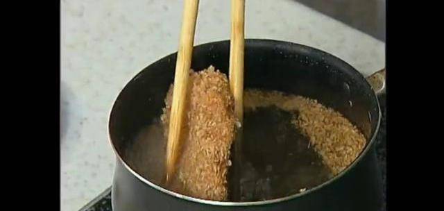 4、 鍋內寬油,油溫5成熱時,下入裹好面包糠的豬扒炸制,炸至兩面金黃色時,撈出控油;