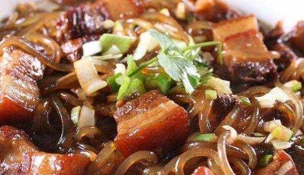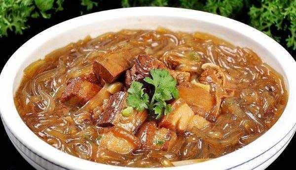 紅薯粉一定要事先用水泡過,最好是用溫水來泡,提前一會兒泡,然後中間要換幾次水,這樣能去除表面的雜質,還會讓口感更好。這時候五花肉已經燉瞭一會兒瞭,裡面的湯已經差不多減少瞭一半,這時候把已經泡好的粉條放進去,一定記得要不停的翻動,不然粉條就會粘在一起,那樣就非常影響口感,還有可能燉的不熟。