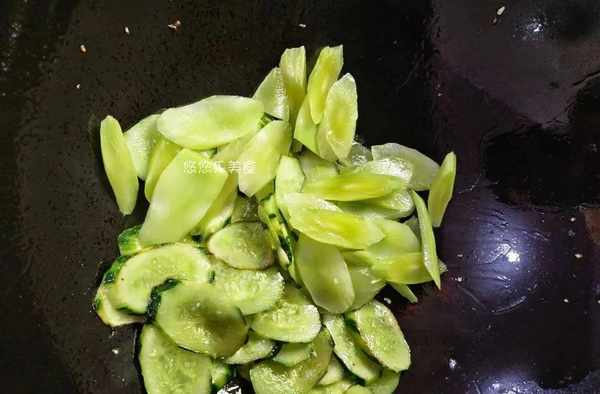4.鍋中的黃瓜炒至均勻後,將切好的萵筍片也倒入鍋中。炒的鍋中的要用大火快炒,用大火炒出來的口感清脆,味道鮮美,而且不發黃;
