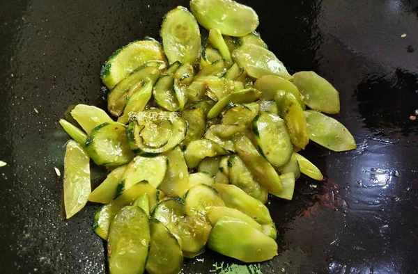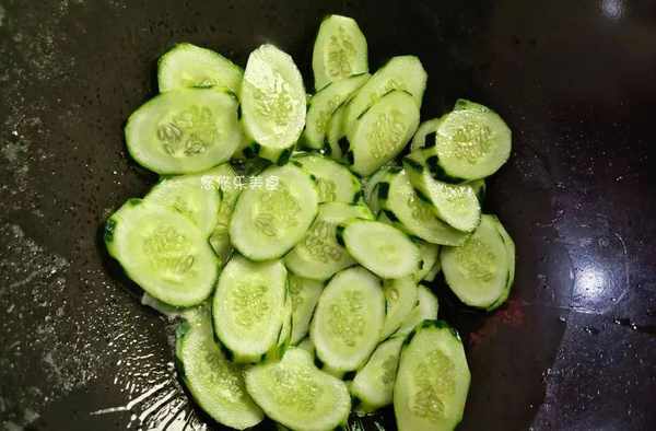 3.準備一個幹凈的鍋,鍋中的水分幹後,在裡面倒入適量的油。鍋中的油溫熱後,將切好的黃瓜片倒入鍋中,用鏟子將鍋中的食材翻炒均勻;