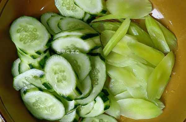 萵筍要先將其表皮去掉,去皮的時候要去除幹凈。這樣煮出來的萵筍脆口好吃,萵筍皮如果沒有清除幹凈,會有一點點的發苦;擔心黃瓜的表面會有農藥殘餘物,所以煮之前我將其削皮瞭。如果不去皮,那就要將其清洗幹凈;萵筍跟黃瓜切片都不能切得太厚,太厚做出來會影響口感;有的人會說做出來的顏色有點暗,其實是因為我加瞭醬油。如果不喜歡的,也可以不用加醬油,直接清炒,一樣好吃。
