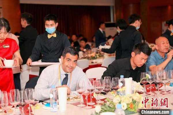 中外客商品鑒葡萄酒。 楊越 攝